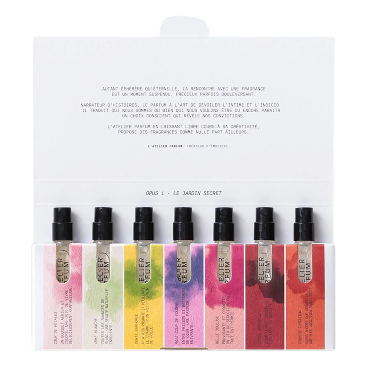 Embrace the thrill of discovery as your curiosity guides you. The OPUS 1 Discovery Kit offers an invitation to explore seven distinct fragrances, each a masterpiece from L’Atelier Parfum’s first opus, The Secret Garden. This collection allows you to step into the bold and imaginative world of our perfumers, where creativity flourishes and boundaries are redefined.